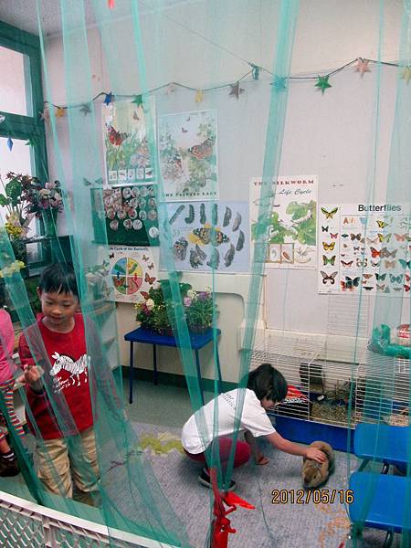 我仔細打量教室的右側,發現原屬於兔子活動的二公尺平方大的區域,已經延伸到教室角度,並圍起綠色的紗簾,成為蝴蝶與兔子共同生活區。在紗簾圍起的四公尺平方區域中,靠窗的部份排了許多透明罐,裡頭有著大小不一的毛毛蟲。靠牆的部份則貼滿了各式海報,有的是關於蝴蝶的蛻變過程,有的則是而外出各種美麗蝴蝶的模樣;而其中最引人注意的,莫過於掛著一個個蟲蛹的布簾,以及穿梭其中的幾隻蝴蝶。原來老師將孩子購買蝴蝶的時間分為三批,每批間隔一個星期,而Ryan被分配到的又是最後一批,所以其實教室中早己進駐了許多蝴蝶幼蟲。最早進駐其中的毛毛蟲,有些已蛻變為蝴蝶,而後續入住的毛毛蟲,也有些進入結蛹的階段,所以這個在教室的小小區域,不但可以隨著時間過去,觀察到蝴蝶蛻變的過程,還可以同時見到蝴蝶從毛毛蟲、蟲蛹與成蟲等等不同時期的模樣。老師這樣的教學方式,也真是用心良若了。