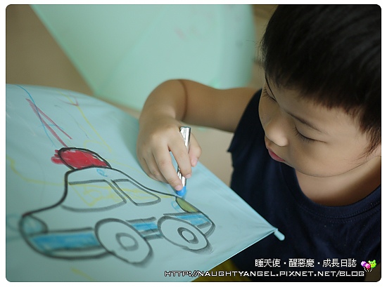 小開哥哥喜歡畫畫,有的畫就可以安靜許久,現在會畫車子,勾出輪廓,塗上顏色了...不過還是鍾情藍色